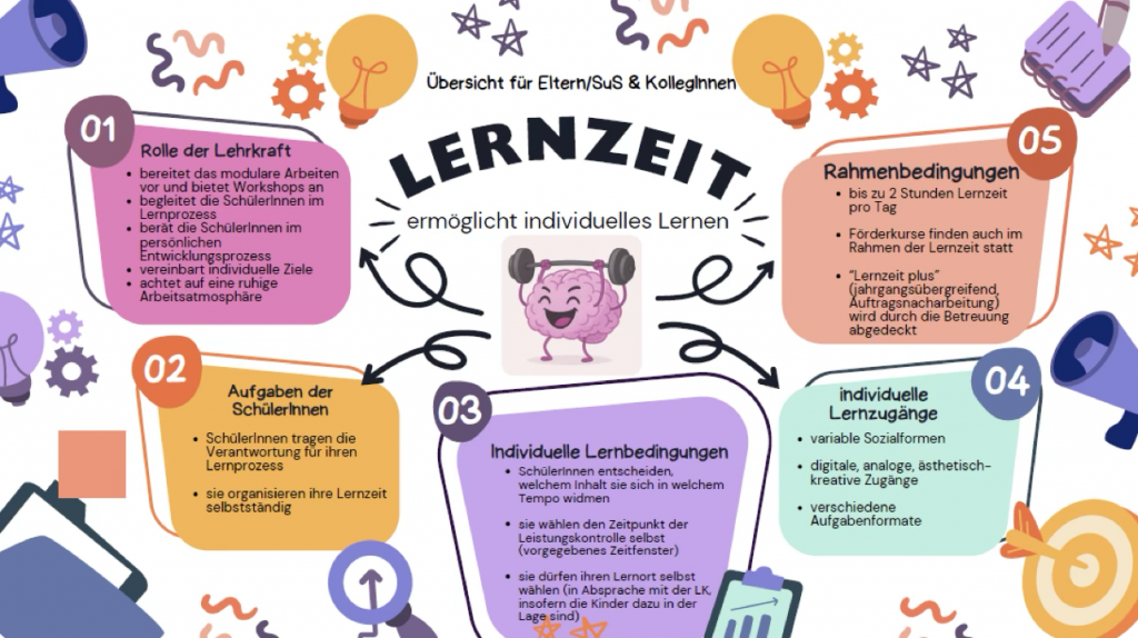 Die Jahrgänge 5-9 beginnen dieses Schuljahr mit der Lernzeit. An jedem Tag arbeiten die Schülerinnen und Schüler im eigenen Tempo an Aufträgen aus Mathe, Deutsch und Englisch. Mit Zwischentests dokumentieren sie ihren Lernfortschritt zu einem selbstgewählten Zeitpunkt. Inhaltlich wird an Modulen aus den Fächern gearbeitet, die langfristig zu bearbeiten sind.
